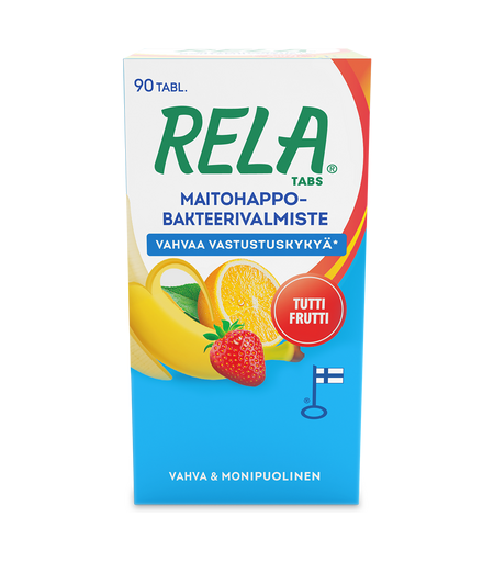 Rela Tabs on monipuolinen yhdistelmä korkealaatuisia maitohappobakteereita ja *C-vitamiinia, joka edistää immuunijärjestelmän normaalia toimintaa. Päiväannos (1 tabletti) sisältää 1,5 miljardia Lacticaseibacillus rhamnosus SP1 ja 1,5 miljardia Bifidobacterium lactis BLC -maitohappobakteereita ja 20 mg C-vitamiinia (25% päivittäisen saannin vertailuarvosta). Hyvänmakuinen Rela Tabs sopii käytettäväksi päivittäin tai kuuriluontoisesti ...