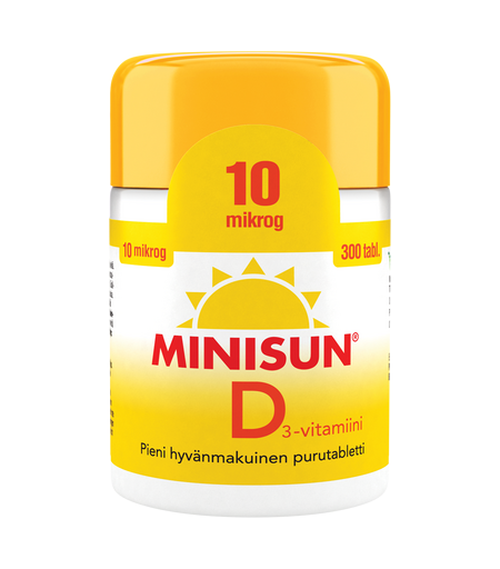 Suomessa kehitetyt Minisun D-vitamiinitabletit sopivat koko perheelle. Minisun 10 mikrog purutabletti sopii käytettäväksi ympäri vuoden.Ksylitolilla makeutetut tabletit voi imeskellä, pureskella, niellä tai murskata. ...