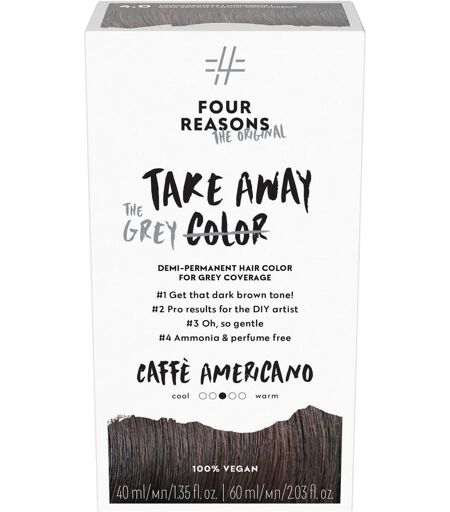 FOUR REASONS Takeaway ei sisällä ammoniakkia eikä hajusteita, ja se on erinomaisesti peittävä puolikestävä väri, joka antaa kauniin ja turvallisen lopputuloksen ja on hellävarainen hiuksille. Tuloksena on elinvoimaiset ja kiiltävät hiukset. Uusin väriteknologia takaa täyteläisen ja intensiivisen värin. 100 % vegaaninen. ...