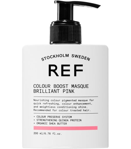 REF Colour Boost Masques with a quick, hydrating enhancement that breathes life into the hair colour. The Masques are composed of strong yet gentle pigments that gradually fade over the course of 2-5 washes. To ensure that hair is cared for, organic Shea Butter softens hair while a combination of Avocado Oil and Argan Oil hydrate hair while providing incredible lustre. Quinoa proteins strengthen hair structure. Nourishing colour pigmented masques for quick refreshing, colour enhancement and weig ...