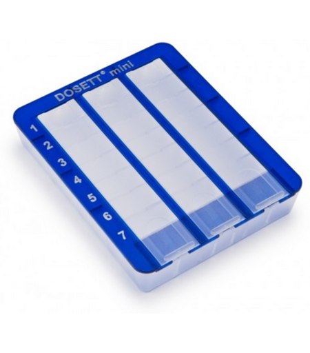 Pienikokoinen lääkennostelija lääkkeiden tilapäiseen säilytykseen ja helpottamaan lääkkeitten annostelua sekä lääkkeen ottamista oikeaan aikaan. Annostelijassa on seitsemän päiväkohtaista 3 osaan jaettua lokerikkoa. Solvetuu hyvin käyttöön silloin, kun päivittäislääkkeitten määrä on pieni.Koko 80x100x18 mm. ...