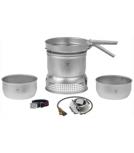 Trangia-keitinsetti kaasupolttimella 1-2 henkilölle Ultrakevyestä alumiinista valmistettu Trangia-keitinsetti kahdella kevyellä duossal-kattilalla ja paistinpannulla. Helppokäyttöisellä kaasupolttimella ruoan valmistaminen on nopeaa ja vaivatonta. Trangian 27-sarjan keittimet ovat mainio valinta 1-2 hengen käyttöön. Mukana kaksi 1 l kattilaa ja halkaisijaltaan 18 cm paistinpannu sekä kahva. Trangialle tuttuun tapaan voit asettaa kattilan Trangiaan kääntämällä kattilatuet alaspäin ja paistinpannun tuulensuojan päälle kääntämällä tuet ylöspäin. Keitin on varustettu tehokkaalla kaasupolttimellta. Kaasupolttimessa on helppo ja tarkka tehonsäätö, jonka ansiosta esimerkiksi ruoan hauduttaminen onnistuu vaivattomasti. Helppokäyttöinen ja tehokas kaasupoltin on yhteensopiva EN417-venttilillä varustettujen kaasupullojen kanssa. Näitä yleisesti käytettyjä kaasukanistereita on saatavilla lähes kaikkialla maailmalla. Keitin on yhteensopiva myös perinteisen sprii-polttimen kanssa. Trangian kaasukeitin on täydellinen valinta retkeilijöille, jotka arvostavat perinteitä, laatua ja käytännöllisyyttä. Sen kompakti muotoilu ja keveys tekevät siitä ihanteellisen kumppanin niin viikonloppuretkille kuin pidemmillekin vaelluksille. 1-2 henkilölle Kaksi 1 l:n kattilaa Paistinpannu halkaisijaltaan 18 cm Tehokas ja helppokäyttöinen kaasupoltin Valmistettu Ruotsissa Alumiinia ja ruostumatonta terästä Tämän setin kattiloissa on käytetty Duossal -materiaaliyhdistelmää, joka on täydellinen yhdistelmä kahta materiaalia: alumiinia ulkopuolella ja ruostumatonta terästä sisäpuolella. Alumiinilla on hyvä lämmönjohtokyky, joten kattilat lämpenevät nopeasti. Ruostumaton teräs puolestaan on kestävä materiaali, joka on helppo puhdistaa. Keitinsetti sisältää: Kaksi 1 litran kattilaa, Duossalia Paistinpannu/kansi, halkaisija 18 cm Tuulensuojat, alempi & ylempi, ultrakevyttä alumiinia Kaasupoltin Hihna 61 cm kuljetusta varten Kahva Kaasupullot ostettavissa verkkokaupasta sekä myymälöistämme Kaasukeittimet sekä -lyhdyt toimivat tavallisella retkikaasulla (ei sisälly myyntipakkaukseen), ja niiden kanssa voi käyttää 100 g, 230 g ja 450 g kaasuja. Yleisimpien valmistajien kaasut sopivat Primus-poltinten standardikierteeseen. Verkkokaupastamme on saatavilla vastuullisempaa Primus SIP -kaasua. Kaasua voit ostaa kaikista myymälöistämme ja asiantunteva henkilökuntamme auttaa mielellään oikean tuotteen löytämisessä. Lue lisää polttoaineista ja eri kaasujen eroista oppaastamme Retkikaasut ja muut retkikeittimien polttoaineet. ...