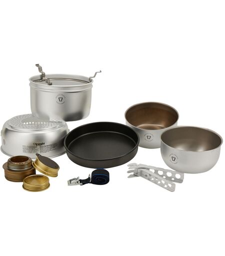 Trangia-keitinsetti 1-2 henkilölle Ultrakevyestä alumiinista ja Duossal-materiaaliyhdistelmästä valmistettu Trangia-keitinsetti spriipolttimella, kahdella kattilalla ja non-stick -paistinpannulla soveltuu 1-2 hengen käyttöön Trangian 27-sarjan keittimet ovat mainio valinta 1-2 hengen käyttöön. Mukana kaksi 1 l kattilaa sekä halkaisijaltaan 18 cm non-stick -paistinpannu ja kahva. Trangialle tuttuun tapaan voit asettaa kattilan Trangiaan kääntämällä kattilatuet alaspäin ja paistinpannun tuulensuojan päälle kääntämällä tuet ylöspäin. 1-2 henkilölle Kaksi 1 l:n kattilaa Paistinpannu halkaisijaltaan 18 cm Varmatoiminen spriipoltin Valmistettu Ruotsissa Alumiinia ja ruostumatonta terästä Duossal on täydellinen yhdistelmä kahta materiaalia: alumiinia ulkopuolella ja ruostumatonta terästä sisäpuolella. Alumiinilla on hyvä lämmönjohtokyky, joten kattilat lämpenevät nopeasti. Ruostumaton teräs puolestaan on kestävä materiaali, joka on helppo puhdistaa. Tämän setin kattiloissa on käytetty Duossal -materiaaliyhdistelmää. Keitinsetti sisältää: Kattila 1 l, sisempi, Duossalia Kattila, 1 l, ulompi, Duossalia Paistinpannu/kansi non-stick-päällysteellä, halkaisija 18 cm Tuulensuojat, alempi & ylempi, ultrakevyttä alumiinia Spriipoltin kierrekorkilla & säätörenkaalla Hihna 61 cm kuljetusta varten Kahva ...