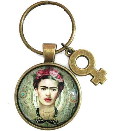 Frida Kahlo glass cabochon keyring with female symbol. Length: 6 cm Cabochon: 3 cm, female symbol: 2 x 1 cm. Material: Bronze coloured metal, glass. ...